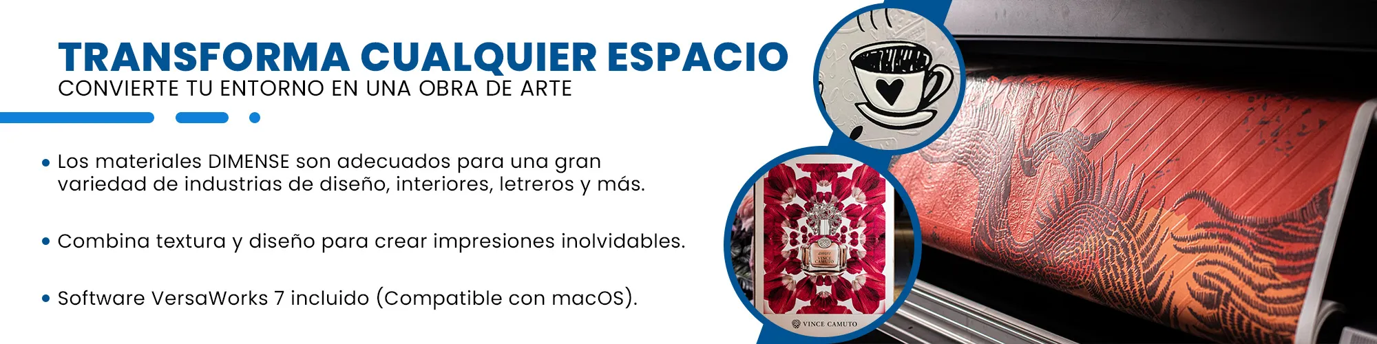 Con la tecnología DIMENSE™, esta impresora va más allá de la decoración de interiores tradicional, agregando inolvidables toques texturados con relieves de hasta 2 mm de altura. Las tintas ecológicas a base de agua y los sustratos libres de PVC hacen de este equipo una solución segura y sostenible para el medioambiente.